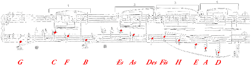 Aber zurück zu unserer Frequenzgeraden, die in ihrem aufgewickelten Zustand lieber Frequenzkreis oder Frequenzzirkel genannt werden sollte: Wir wollen nun alle Töne der eingestrichenen Tonleiter auf diesem Kreis wiederfinden, die unser Klavier zu bieten hat, also auch die Halbtöne der schwarzen Tasten. Reizvoll harmonisch und auch für einen völligen Anfänger nicht zu schwer zu spielen, ist folgende Reihenfolge: